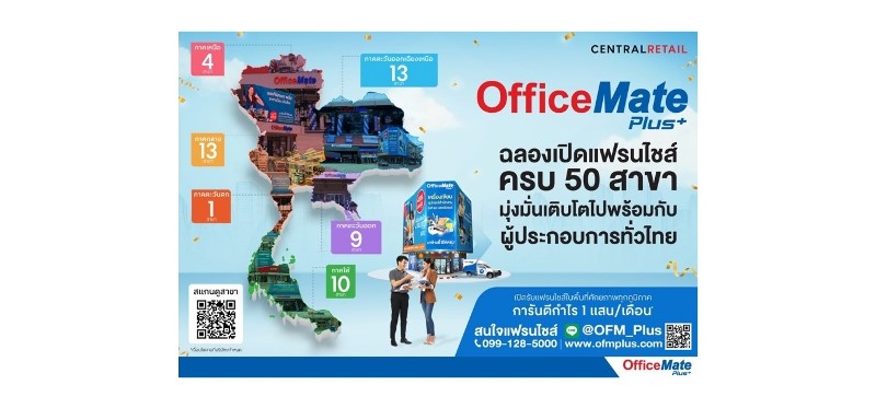 ออฟฟิศเมท พลัส แฟรนไชส์ร้านอุปกรณ์สำนักงานเพื่อธุรกิจ ในเครือเซ็นทรัล รีเทล เจ้าของรางวัล Franchise of The Year และ Best Innovation Franchise 2022 ประกาศความสำเร็จฉลองครบ 50 สาขา ได้รับความไว้วางใจจากผู้ประกอบการท้องถิ่นที่สนใจลงทุนเปิดร้านแฟรนไชส์อย่างต่อเนื่อง โดยปัจจุบันครอบคลุม 44 จังหวัดทั่วประเทศ พร้อมเดินหน้าเปิดรับสมัครแฟรนไชส์ซีรุ่นใหม่ไฟแรงจากทุกภูมิภาคมาเติบโตแบบติดสปีดไปด้วยกัน…!