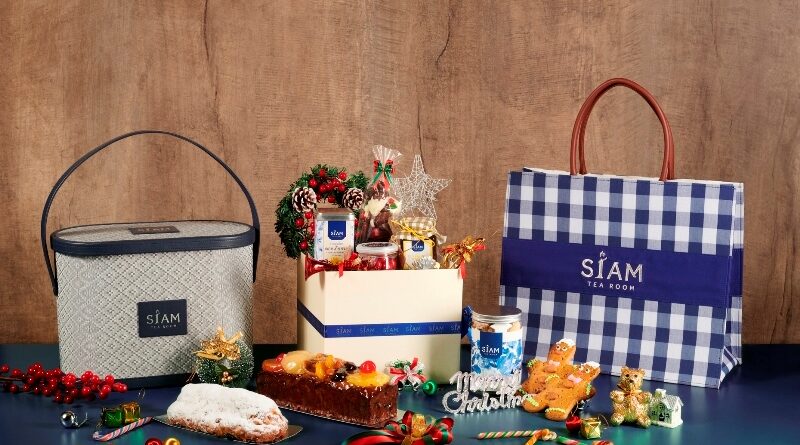 - กระเช้าของขวัญ “เดอะ มาร์คีส์” ราคา 3,200 บาท – ชุดของขวัญบรรจุในกระเป๋าผ้าสีน้ำเงินสุดคลาสสิกที่มาพร้อมหลากหลายเมนูขนมหวาน อาทิ เค้กผลไม้สไตล์อังกฤษ คริสมาสต์สโตลเลน คริสมาสต์คุ้กกี้ มะเขือเทศอบแห้ง ขนมปังขิงรูปตุ๊กตา ช็อคโกแลตแซนต้าครอส ลูกกวาดรูปไม้เท้า ช็อคโกแลตเคลือบซอสแครนเบอร์รี่ พร้อมกับแยมเสาวรส และ กล่องน้ำชาเกรดพรีเมี่ยมจากห้องอาหารสยาม ที รูม