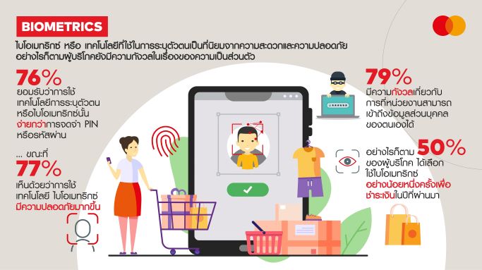 ผลวิจัย Mastercard New Payments Index 2022 ชี้ผู้บริโภคชาวไทยเกือบ 80% ยอมรับว่าการใช้ข้อมูลไบโอเมทริกซ์ (Biometric) หรือ การเก็บข้อมูลอัตลักษณ์บุคคลสำหรับยืนยันตัวตน เช่น การสแกนลายนิ้วมือ การยืนยันลักษณะบนใบหน้า มีความปลอดภัยสูงกว่าวิธีการอื่นๆ ไม่ว่าจะเป็นการกรอกรหัส PIN อย่างไรก็ดียังคงมีประเด็นเรื่องความเป็นส่วนตัว โดยผู้ตอบแบบสอบถามราว 79% มีความวิตกกังวลว่าอาจมีองค์กรธุรกิจต่าง ๆ สามารถเข้าถึงข้อมูลไบโอเมทริกซ์ของพวกเขาได้
