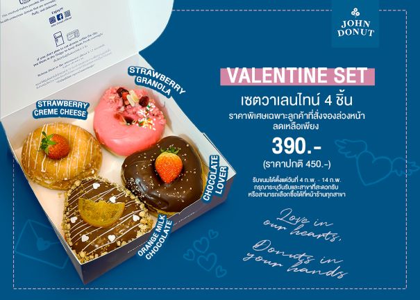 บอกรักให้หวานกว่าใครไปกับ “John’s valentine Box Set” สามารถสั่งจองล่วงหน้าได้ตั้งแต่วันนี้ – 13 ก.พ.66 ราคาพิเศษสำหรับคุณที่สั่งจองล่วงหน้าเท่านั้น เพียง 390 บาท จากราคาปกติ 450 บาท และรับโดนัทได้ตั้งแต่วันที่ 4 ก.พ. – 14 ก.พ.66
