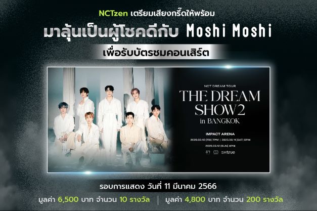 สำหรับกติกาเข้าร่วมสนุกเพื่อลุ้นเป็นผู้โชคดีกับ Moshi Moshi เพื่อลุ้นรับบัตรคอนเสิร์ต NCT DREAM TOUR ‘THE DREAM SHOW2: In A DREAM’ in BANGKOK รอบการแสดงวันที่ 11 มีนาคม 2566 บัตรมูลค่า 6,500 บาท จำนวน 10 รางวัล และบัตรมูลค่า 4,800 บาท จำนวน 200 รางวัล เพียงช้อปสินค้าชนิดใดก็ได้ที่ร้าน Moshi Moshi ครบทุก 500 บาท* รับ 1 สิทธิ์ลุ้นชมคอนเสิร์ต โดยสามารถส่งได้ไม่จำกัดสิทธิ์ สามารถช้อปและลงทะเบียนได้ ตั้งแต่วันที่ 13 ก.พ. 2566 (เริ่ม 10.00 น.) – วันที่ 3 มี.ค. 2566 (สิ้นสุดการลงทะเบียน 23.59 น.) แค่นำใบเสร็จไปลงทะเบียนที่ https://bit.ly/3DXfG0I เพื่อร่วมกิจกรรม โดยจะประกาศรายชื่อผู้โชคดี Lucky Draw ผ่านทาง Facebook: Moshi Moshi วันที่ 7 มี.ค. 2566 เวลา 16.00 น. เป็นต้นไป ผู้เข้าร่วมกิจกรรมจะสามารถรับรางวัลสูงสุดได้เพียง 1 รางวัลเท่านั้น