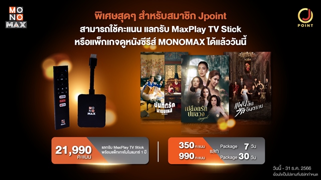 “MONOMAX” (โมโนแมกซ์) สุดยอดหนังดี ซีรีส์ดังพากย์ไทยครบทุกเรื่อง จับมือ J POINT ระบบสะสมคะแนนในกลุ่ม JAYMART GROUP มอบสิทธิประโยชน์พิเศษสำหรับ สมาชิก “J POINT” ที่ชื่นชอบการดูหนังและซีรีส์ โดยสามารถใช้ 21,990 J POINT แลกรับ MaxPlay TV Stick พร้อมแพ็คเกจดูโมโนแมกซ์ 1 ปี หรือ ใช้ 350 J POINT แลกรับ แพ็กเกจดูหนัง ซีรีย์ 7 วัน และถ้ายังไม่จุใจ สามารถใช้ 990 J POINT แลกรับแพ็กเกจดูหนัง ซีรีส์ได้ถึง 30 วัน