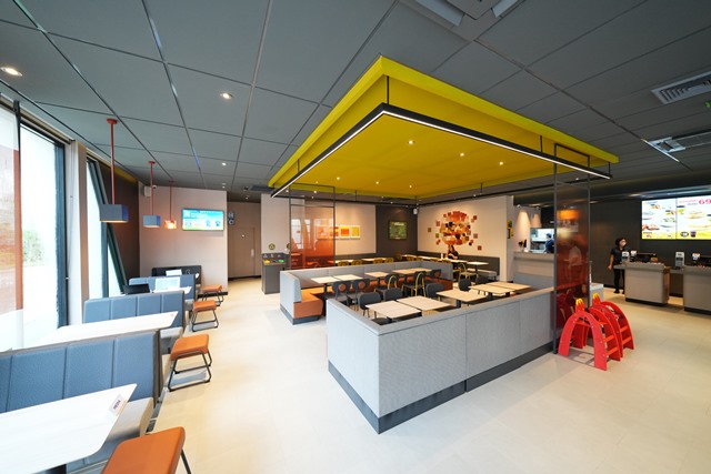 พร้อมถ่ายทอด ดีไซน์ ‘CUBE’ ผ่านชิ้นงานกราฟฟิกในรูปทรงสี่เหลี่ยมจัตุรัส ตกแต่งภาพบนผนังในรูปแบบภาพที่กระจายตัวเปรียบเหมือนการระเบิดความอร่อยและภาพโพลาลอยด์ สื่อถึงเมนูอาหารหรือไอคอนอันเป็นเอกลักษณ์ของแมคโดนัลด์ เช่น เมนูเบอร์เกอร์ เมนูกาแฟ และโลโก้แบรนด์ เป็นต้น ทั้งยังคงเน้นการสร้างบรรยากาศอันสบายตา อบอุ่น ผ่อนคลาย ด้วยโทนสีจากธรรมชาติอย่างสีน้ำตาลอิฐ และสีเขียว