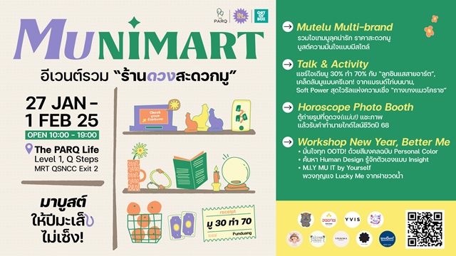 มาบูสต์ประสบการณ์สายมูยุคใหม่ที่ทั้งสนุกและทันสมัย กับกิจกรรมเติมพลังบวก เสริมดวงในแบบของตัวเองจนปีมะเส็งนี้ไม่มีทางเซ็งอีกต่อไป ในงาน “MUNIMART” อีเวนต์รวมร้านดวงสะดวกมู วันที่ 27 ม.ค. – 1 ก.พ. 2568 ที่ The PARQ Life, ชั้น 1, Q Steps (MRT ศูนย์การประชุมแห่งชาติสิริกิติ์ ทางออก 2)