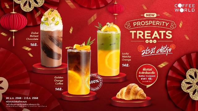 เครื่องดื่มมงคลจากแคมเปญ Prosperity Treats พร้อมให้บริการตั้งแต่วันที่ 20 มกราคม 2568 – 2 มีนาคม 2568 (หรือจนกว่าสินค้าจะหมด) ที่ร้านคอฟฟี่เวิลด์ทุกสาขาทั่วประเทศ รวมถึงบริการจัดส่งผ่านช่องทางเดลิเวอรี