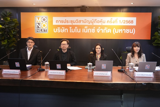 นวมินทร์ ประสพเนตร ประธานกรรมการ ประธานเจ้าหน้าที่บริหาร (รักษาการ) บริษัท โมโนเน็กซ์ จำกัด (มหาชน) พร้อมด้วย หทัยทิพย์ หมัดจุ้ย ผู้อำนวยการธุรกิจ Monomax บริษัท โมโน สตรีมมิ่ง จำกัด, พงศ์พันธุ์ ทองเพียรพงษ์ ผู้ช่วยผู้อำนวยการฝ่ายบัญชีและการเงิน และปิติฤดี ศิริสัมพันธ์ เลขานุการบริษัทและผู้อำนวยการอาวุโสฝ่ายกำกับดูแลกิจการและสื่อสารองค์กร บริษัท โมโนเน็กซ์ จำกัด (มหาชน) หรือ MONO จัดการประชุมวิสามัญผู้ถือหุ้น ครั้งที่1/2568ผ่านสื่ออิเล็กทรอนิกส์แบบออนไลน์