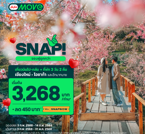 AirAsia MOVE เผย 3 พฤติกรรมนักท่องเที่ยวช่วงเทศกาลวาเลนไทน์ ทั้งสายเที่ยวฉายเดี่ยวหรือคนโสด (Solo Traveller) และสายคู่รักนักเดินทาง – คนมีคู่ (Couple Traveller) พร้อมออกแพ็กเกจท่องเที่ยวสุดคุ้มให้คุณได้เติมหวานจนน้ำตาลเรียกพี่กับวาเลนไทน์นี้ รักใครให้พาไปเที่ยวกับ AirAsia MOVe 𝗦𝗡𝗔𝗣! ด้วยดีลคุ้มสุดๆ เที่ยวบินแอร์เอเชียไป-กลับ + ที่พัก 3 วัน 2 คืน กับแพ็กเกจแนะนำสู่เส้นทางสุดโรแมนติก: เชียงใหม่ เริ่มต้น 3,268 บาท/ท่าน* กรุงเทพฯ เริ่มต้น 4,952 บาท/ท่าน* กัวลาลัมเปอร์ เริ่มต้น 6,703 บาท/ท่าน* โอซาก้า เริ่มต้น 17,581 บาท/ท่าน* และเส้นทางอื่นๆ อีกมากมาย ลดเพิ่ม 450 บาท** ทุกแพ็กเกจ เพียงใช้โค้ด 𝗦𝗡𝗔𝗣𝗡𝗢𝗪 ที่หน้าชำระเงิน  หากคุณเดินทางท่องเที่ยวบ่อย หรือชอบความสะดวกสบายในการวางแผน แพ็กเกจแบบนี้ช่วยลดความยุ่งยากไปได้  เพราะคุณจะได้ราคาที่ถูกกว่าการจองตั๋วและที่พักแยกกัน  มีตัวเลือกโรงแรมหลากหลาย ตั้งแต่ราคาประหยัดไปจนถึงระดับพรีเมียม และสามารถเลือกเส้นทางบินและช่วงเวลาที่ต้องการได้ตามสะดวก  จองเลย 𝗦𝗡𝗔𝗣 ตั้งแต่วันที่ 3  – 14 กุมภาพันธ์ 2568 ออกเดินทางได้ตั้งแต่ 3 กุมภาพันธ์ – 31 พฤษภาคม 2568 *ราคาที่แสดงเป็นราคาต่อท่าน สำหรับการจองห้องพักเมื่อเข้าพัก 2 ท่าน รวมค่าโดยสารไป-กลับและการเข้าพัก 3 วัน 2 คืน **เมื่อมียอดจองขั้นต่ำ 7,700 บาท โค้ดมีจำนวนจำกัดต่อวัน เป็นไปตามข้อกำหนดและเงื่อนไขของบริษัทฯ