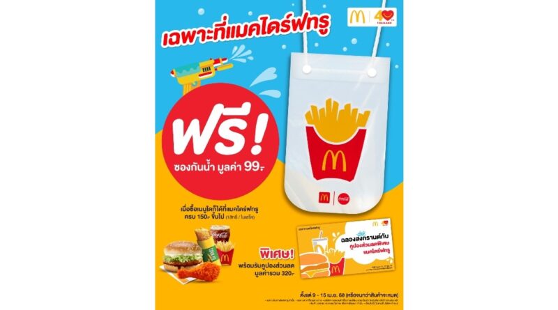 สงกรานต์ปีนี้เล่นน้ำไม่ต้องกลัวมือถือเปียก แมคโดนัลด์ ส่งความสุขฉลองครบรอบ 40 ปีอย่างต่อเนื่อง จัดเซอร์ไพรส์กับแคมเปญเติมความสุข ต้อนรับเทศกาลสงกรานต์ แมคไดร์ฟทรู แจกฟรี! ซองกันน้ำ Limited Edition ลายเฟรนฟรายส์สุดคิวท์ มูลค่า 99 บาท พร้อมคูปองส่วนลดสุดคุ้ม’ (มูลค่ารวม 320 บาท) เมื่อซื้อเมนูใดก็ได้ที่แมคไดร์ฟทรูครบ 150 บาทขึ้นไป (จำกัด 1 สิทธิ์ / ใบเสร็จ) เริ่มแล้วตั้งแต่วันนี้ – 15 เม.ย. 68 หรือจนกว่าสินค้าจะหมด สามารถตรวจสอบสาขาที่ร่วมกิจกรรมได้ที่ http://bit.ly/McTHDrive อ่านรายละเอียดเพิ่มเติมและติดตามแคมเปญอื่น ๆ ได้ที่ Facebook.com/McThai