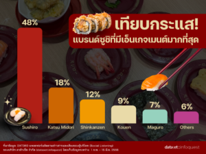 ในส่วนของแบรนด์อื่นๆ (6%) แม้อาจมีสัดส่วน Engagement ที่น้อยกว่า แต่ก็ยังคงมีฐานลูกค้าที่เหนียวแน่นและมีกระแสบนโซเชียลอย่างต่อเนื่อง สะท้อนให้เห็นว่าตลาดซูชิยังมีความหลากหลาย และมีแนวโน้มเติบโตในทุกกลุ่ม ไม่ว่าจะเป็นซูชิสายพาน ซูชิพรีเมียม หรือซูชิทั่วไป
