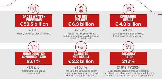 สำหรับภาพรวมผลประกอบการในช่วงครึ่งปีแรก 2025 เจนเนอราลี่ กรุ๊ป สามารถสร้างการเติบโตอย่างต่อเนื่องเมื่อเทียบกับช่วงเดียวกันของปีก่อน โดยมี เบี้ยประกันภัยรับรวม (Gross Written Premium) อยู่ที่ ประมาณ 1.94 ล้านล้านบาท (50.5 พันล้านยูโร) เพิ่มขึ้น 0.2% ซึ่งได้รับแรงหนุนจากผลการดำเนินงานที่แข็งแกร่งของกลุ่มประกันวินาศภัย (P&C) ที่เติบโตขึ้น 7.6% โดยเฉพาะในกลุ่มประกันที่ไม่เกี่ยวกับยานยนต์ และกลุ่มประกันชีวิต (Life) ที่มีกระแสเงินสดรับสุทธิ (Life Net Inflow) 2.44 แสนล้านบาท ( 6.3 พันล้านยูโร) โดยกลุ่มผลิตภัณฑ์ด้านความคุ้มครองและสุขภาพ รวมถึงผลิตภัณฑ์ควบการลงทุนอย่างยูนิตลิงค์ ยังคงได้รับความสนใจจากลูกค้าอย่างต่อเนื่อง มีอัตราส่วนรวมก่อนการคิดลดมูลค่า (Undiscounted Combined Ratio) ปรับตัวดีขึ้นเป็น 93.1% (-1.8 จุดเปอร์เซ็นต์)