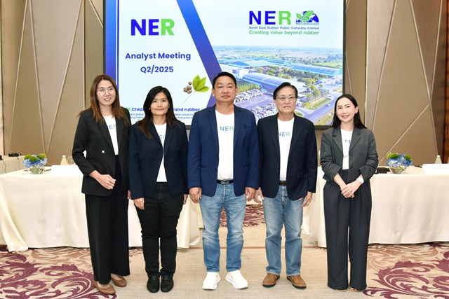 นายชูวิทย์ จึงธนสมบูรณ์ (ยืนกลาง) ประธานเจ้าหน้าที่บริหาร พร้อมด้วย นายศักดิ์ชัย จงสถาพงษ์พันธ์ รองประธานเจ้าหน้าที่บริหารสายงานบัญชี – การเงิน และนางสาวปาร์ย อรรถพิสาล รองประธานเจ้าหน้าที่บริหารสายงานพัฒนาธุรกิจ บริษัท นอร์ทอีส รับเบอร์ จำกัด (มหาชน) หรือ NER ผู้ดำเนินธุรกิจผลิตและจำหน่าย ยางแผ่นรมควัน ยางแท่ง ยางผสม และสินค้าปลายน้ำแผ่นยางพาราปูพื้นคุณภาพสูง เพื่อจำหน่ายไปยังผู้ผลิตในอุตสาหกรรมยานยนต์ กลุ่มผู้ค้าคนกลาง ทั้งในประเทศและต่างประเทศ พบนักวิเคราะห์และนักลงทุน สรุปผลการดำเนินงานไตรมาส2 ประจำปี 2568 พร้อมแผนธุรกิจครึ่งปีหลัง ณ โรงแรมสยามเคมปินสกี้ กรุงเทพ ถนนพระราม1 เมื่อเร็วๆ นี้