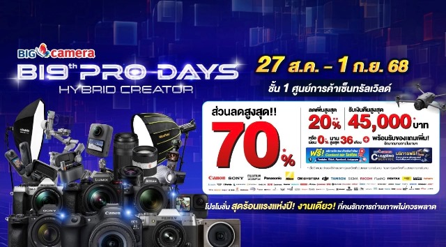สัมผัสเทคโนโลยีและนวัตกรรมแห่งการถ่ายภาพที่สุดแห่งปี BIG Camera BIG Pro Days ครั้งที่ 19: Hybrid Creators “ก้าวใหม่ที่ผสมผสานความสร้างสรรค์และนวัตกรรมอย่างลงตัว” วันที่ 27 สิงหาคม – 1 กันยายน 2568 ชั้น 1 ศูนย์การค้า Central World โซน Central Court, Beacon 2, Eden 1, Dazzle